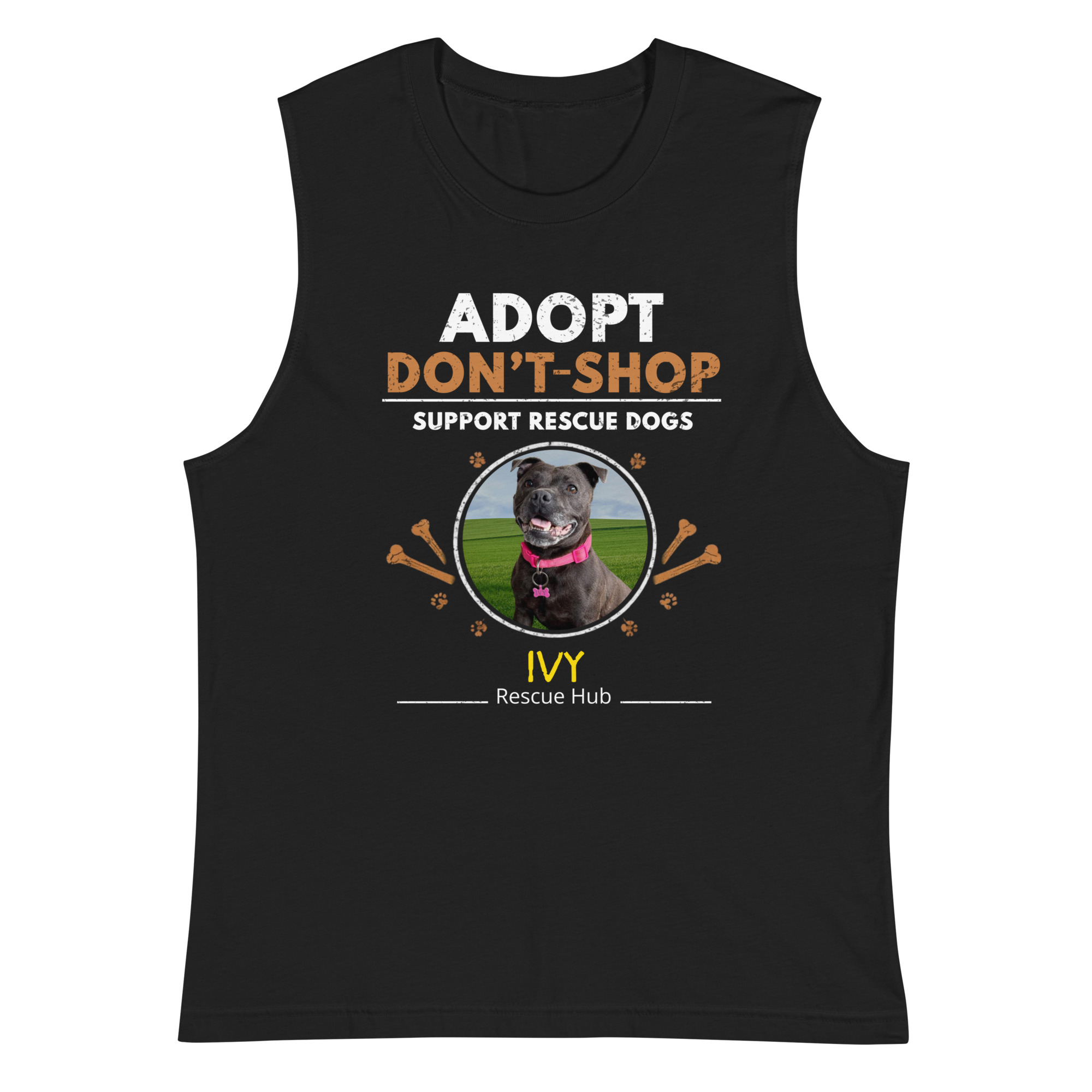 This Rescue Hub fundraiser muscle tank features our bold Adopt Don’t Shop message and helps spread awareness for rescue dogs everywhere. Every purchase helps support the ongoing rescue, care, and rehoming of dogs who deserve a second chance.