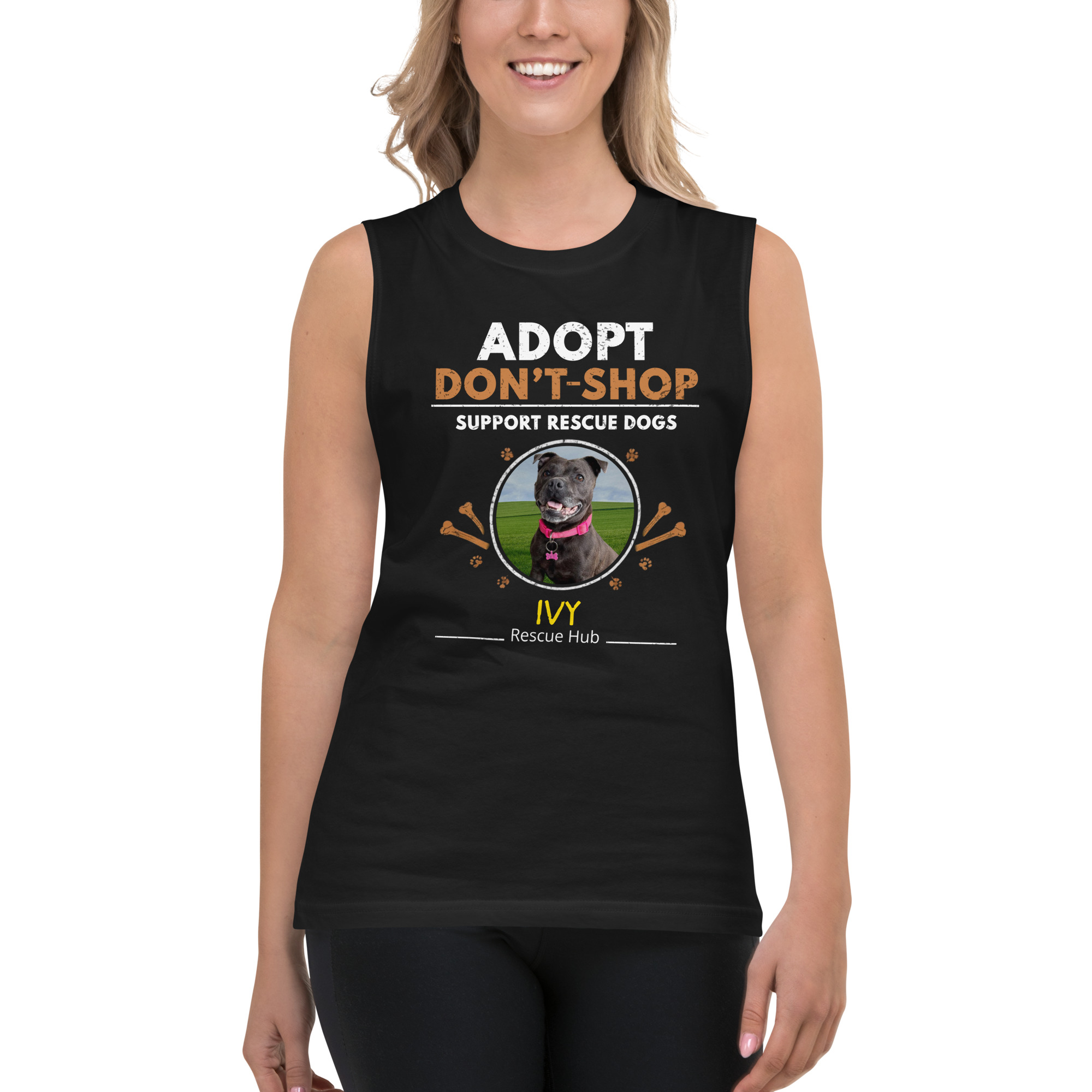 Comfortable, breathable, and easy to wear — this muscle tank is perfect for warmer days, workouts, or simply sharing the Adopt Don’t Shop message wherever you go.