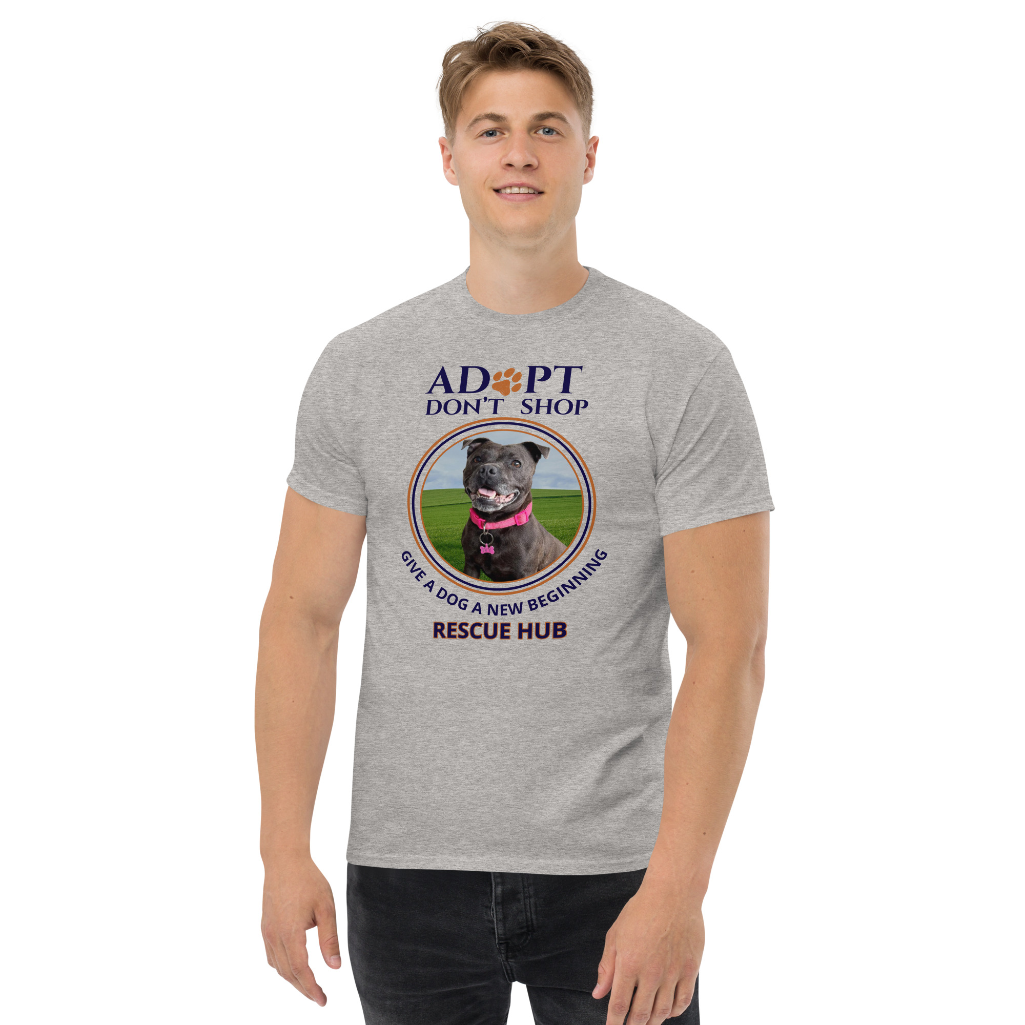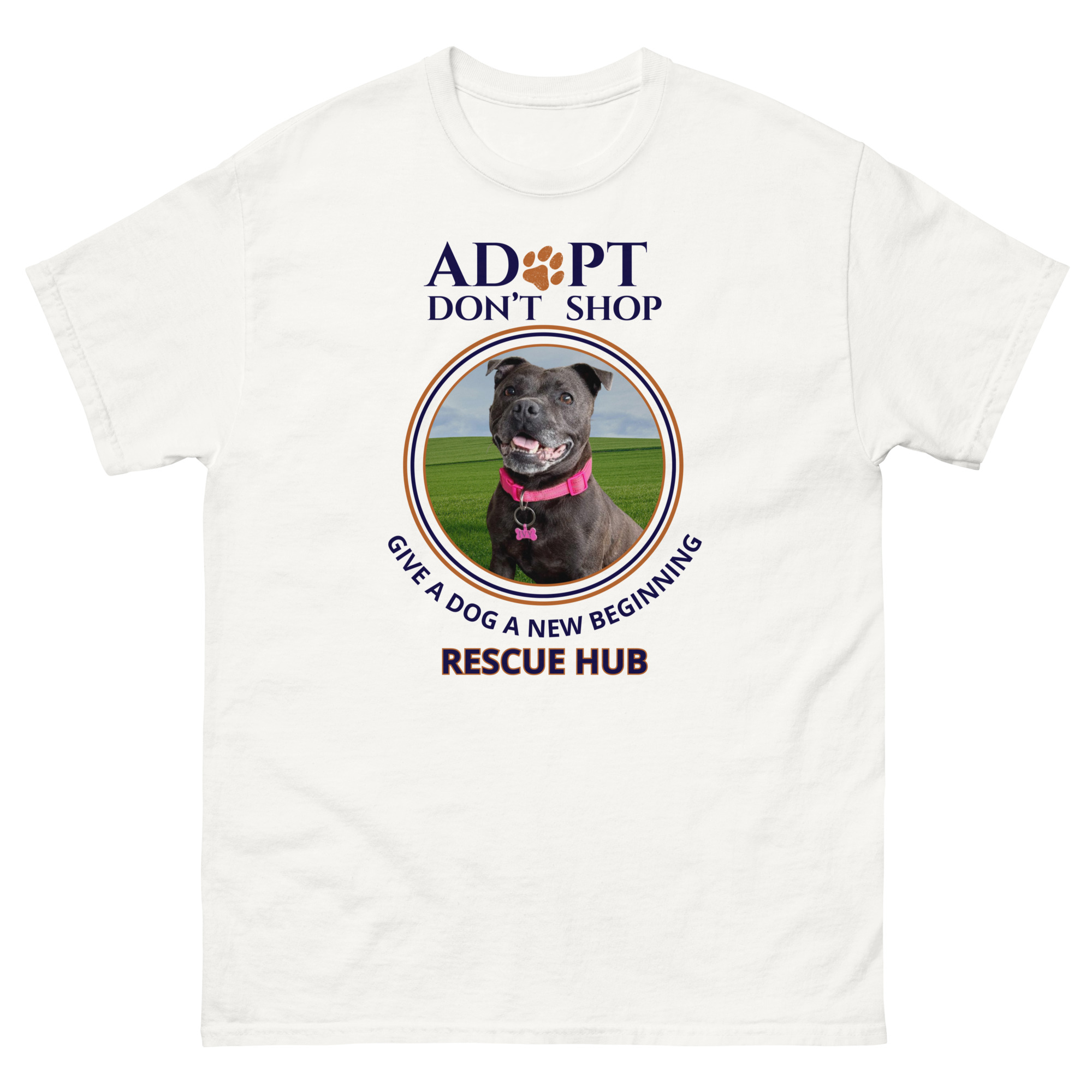 This Rescue Hub fundraiser t-shirt features our bold Adopt Don’t Shop message and highlights one of the beautiful dogs who has been part of the Rescue Hub journey. Every purchase helps support the ongoing rescue, care, and rehoming of dogs who deserve a second chance.