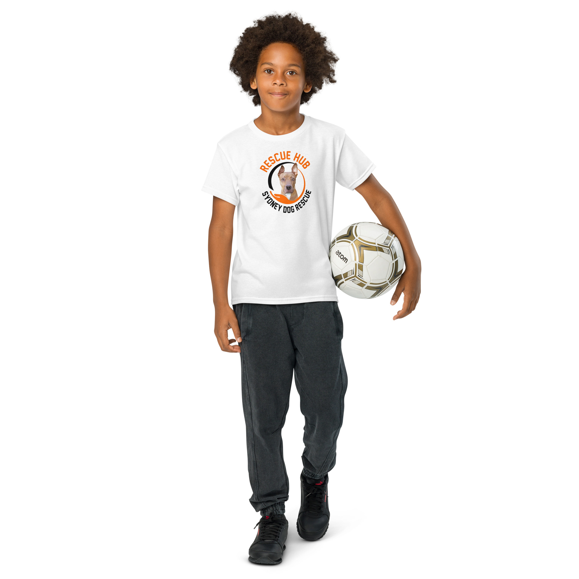 The Rescue Hub Sydney Dog Rescue youth t-shirt is made for comfort, fun, and making a difference. Featuring our Rescue Hub logo with one of our rescue dogs, this tee helps kids show their love for animals while supporting dogs in need.